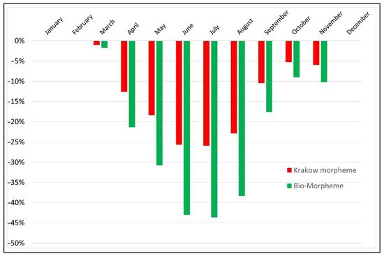 Comparison of the relative reduction of rainwater flow to the municipal sewer system between the Krakow housing complex—Krakow-Morpheme and Bio-Morpheme.