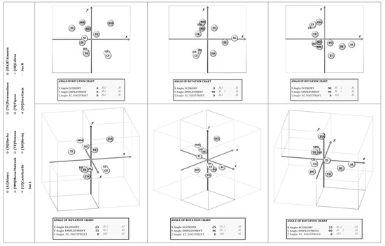The complementary 3D version (Figure 3) is developed as a cube representation of a three-axis system, crossing for visualisation purposes at point (0; 0; 0), with the evaluation depiction scale of normalised values ranging from −1 (minimum sample value) to 1 (maximum sample value). For this version, the axis crossing point represents the average value of each comparatively normalised sustainability dimension. As such, the user is offered the possibility to benchmark a destination’s sustainability performance against the sample average. The tool’s horizontal x-axis depicts economic performance, vertical y-axis represents social performance, and Cartesian z-axis depicts ecological footprint values. The evaluation matrix is divided into eight quadrilles, each signified by lower (L) and higher (H) performances per dimension of sustainability: LLL; LHH; LLH; HHH; HLL; HHL; LHL; and HLH. Hence, more “Sustainable” (HHL) destinations are again expected to be depicted in the Cartesian surface quartile defined simultaneously by higher (H) economic performance values (0–1 on the x-axis), higher (H) social performance values (0–1 on the y-axis) and lower (L) environmental footprint values (0–1 on the z-axis), while “Non-Sustainable” (LLH) destinations are expected in the Cartesian surface quartile defined simultaneously by lower (L) economic performance values (0–1 on the x-axis), lower (L) social performance values (0–1 on the y-axis) and higher (H) environmental footprint values (0–1 on the z-axis). In order to facilitate comprehension, the axes’ arrows continuously signal the direction of maximum performance per dimension. However, a rotation matrix allows for evaluation quadrilles’ continuous rotation to support clearer visualization against three or even two dimensions (Figure 3). Both visualisation interfaces produce independent yet complementary sustainability evaluations. However, the user should keep in mind that they are not directly comparable, since they depict different evaluation variables and are assessed in different measurement systems.