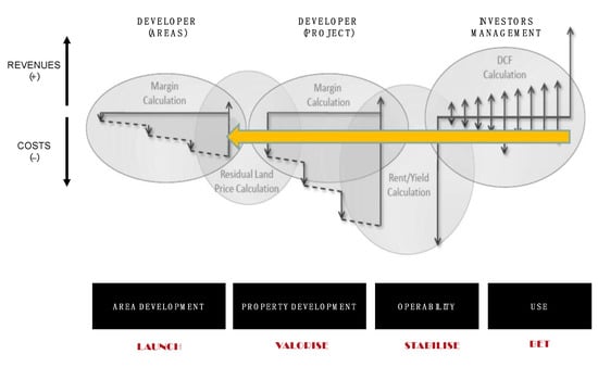 The production process takes place over a period of time in which the various cost items are not only incurred at deferred moments in time but can be carried out by different subjects and actors intervening in the property market. A number of key figures can be clearly identified in this process: the figure of the developer, who commits to the transformation and invests with an expected return linked to the risk he/she bears; the figure of the manager of an activity, who must allow an income to be paid to the owner developer; and the Public Administration, who defines the rules by which the developer and manager transform and use the property.