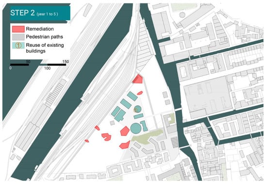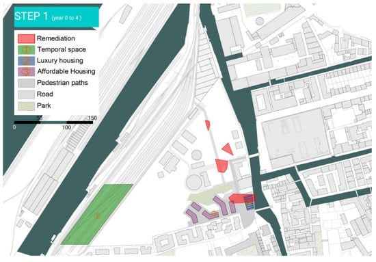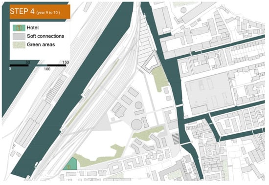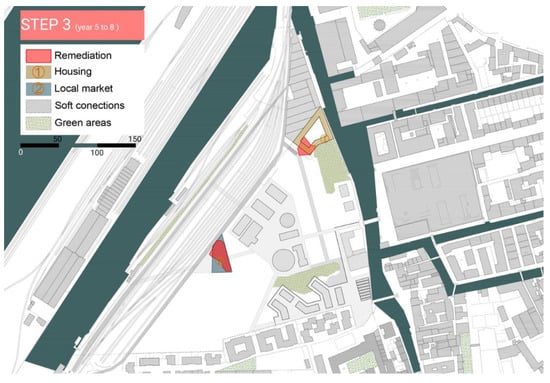 Starting from the idea that markets are shaping cities through land price variations in space and time [30], the first step (year 0 to year 4, see the image of step one, Figure 4) is a launching step intended to foster the realisation of biggest projects. The projects developed on the less polluted areas with lower reclamation costs through a wise mix of temporary and long-term destinations, of affordable and luxury dwellings, and combined with the realisation of roads and green areas constitute the initial unavoidable trigger to change the image, the value and the demand of this part of Venice. Temporary uses, which are fundamental for the “launch” phase, are represented by the establishment of a market in the railway area. Inspired by the “Metropolitan Market” experiments in Milan and Turin, this type of intervention allows for a very quick recovery of railway stations/areas to create spaces dedicated to quality food that is linked to the local production chain and is focused on offering, in rotation, artisanal products coming from all over Italy. This type of intervention foresees lease contracts for railway stations/areas of less than a year, with average setting-up times of less than a month and with low construction costs.