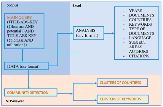 The first stage presents a general search based on the keywords selected. From 1974 to the end of 2021, a total number of 7117 documents were obtained. The second stage involves the export of the metadata of the documents to a .csv file, which was analyzed with Excel software. Then tables and figures were created and described focusing on the biomass potential and its utilization topics on the world scale. The third stage reflects on the bibliographic analysis through the performance of descriptive data by using the VOSviewer bibliometric tool to analyze co-occurrences of keywords and collaborations between countries in terms of publication documents, where the different clusters were analyzed. Once the results of the Scopus search related to biomass potential and utilization were obtained, this study executed an analysis of the scientific production and its trend, the number of publications based on countries on a world map, the evolution in the use of keywords, the publication types of documents, the language of the documents, the main subject areas in this field, the main authors in the subject, and their number of citations.