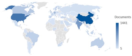 Figure 3 shows world scientific production by country of origin. According to the number of publications, each country has an assigned color that goes from dark blue, which indicates a greater number of publications, to light blue, which indicates a lower number of publications. In contrast, the non-existence of publications is marked with light brown. China stands as the country with the highest number of publications (1441) in this field, followed by the United States (1124), India (763), Germany (416), and the United Kingdom (350). From this, significantly, it can be concluded that biomass potential and utilization in developed countries is a crucial component of attaining sustainable development, especially for energy use, while in developing countries, food and feed production has higher significance. The number of documents is in line with the biomass potential of these countries, as was mentioned in the literature review [,,,], and is also related to the promising targets set for the future and a very diverse utilization of biomass, especially in India. In this country, biogas production is very popular, not environmentally but especially from the sludge management point of view.