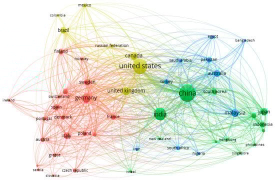 For biomass use, the five main consumers are the same countries that are the leading net importers, countries such as the United States, mainland China, South Korea, Japan, and the United Kingdom. At the same time, the top countries in terms of net exporters are the same as the main exploiters of biomass resources, including countries such as Brazil, India, Indonesia, Cyprus, and Latvia []. As is shown in Figure 3, the interest of researchers in biomass potential and its utilization on a world scale is quite high, since 195 countries have published at least one document related to the given topic. At the same time, 90 countries have published more than five documents, followed by 58 countries that have published more than 20 documents on the related topic, and more than 100 articles related to biomass topics were published from 24 countries each. Figure 4 presents the 50 most important countries, which have published at least 26 documents, out of 195 total countries. These countries form a network of co-authors in which authors are indirectly linked through their participation in one or more publications. The 50 items are categorized within four clusters. The red cluster includes most European countries, followed by the green cluster, which includes countries from Southeast Asia, including China and India, as the most important ones in this cluster. In the blue cluster, the main countries are Malaysia and Australia, including a few countries from West and South Asia and two countries from Africa. Most of the countries in the yellow cluster are from North and South America, including also UK and Russian Federation. The central actors of the clusters are also the countries that mainly provide the connection between the clusters.