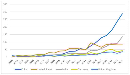 Figure 5 represents the evolution of the number of documents from the five countries with the highest scientific production for biomass potential and its utilization for the last 21 years. As mentioned before, the growth trend of publications marks a significant increase after 2012 globally. However, the upward growth in these countries in terms of publication of documents on the potential and utilization of biomass is observed after 2014. While 2021 is when the peak was reached for China and India, and the upward trend is more emphasized for these two countries due to the potential to provide employment and its widely available resources. Other countries have had a more stable stance regarding the number of publications in recent years.