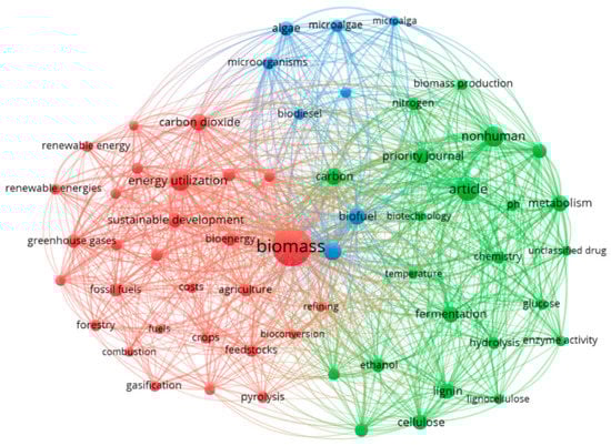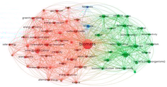 Keyword co-occurrence network regarding biomass potential and its utilization from 2012 to 2021. Source: created by the authors. Clusters name: red: energy use, its feedstock, and environment, green: microbiological, technological, publication, and general items, blue: next-generation transportation fuels.