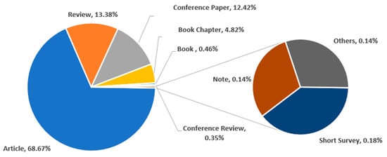 A number of 7117 documents were obtained from the search carried out considering various fields and types of documents for the period 1974–2021. Articles accounted for the majority of the different types of publications (68.67%), followed by Reviews (13.38%) and Conference Papers (12.42%). The low number of other documents can be attributed to the fact that conference proceedings cannot be accessed in Scopus. Figure 8 shows the various categories of papers relating to biomass potential and utilization from 1974 to 2021.