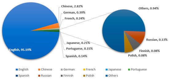 In terms of the languages used in the publications, English comprised 95% of the papers, whereas more minor national languages are not typical (well under 1%). Figure 9 shows the percentage of different languages in which the various bibliometric analysis materials have been published.