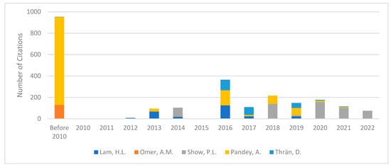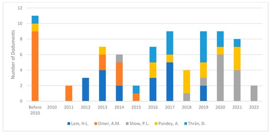 This study also carried out an analysis of the most prominent authors in the field of biomass potential and its utilization. Figure 11 presents the scientific output of the five main authors on this subject. Lam, H.L. stands out in this field with 19 publications, followed by Omer, A.M. (17) and Show, P.L. (15), whereas Pandey, A. and Thrän, D. have 14 publications.