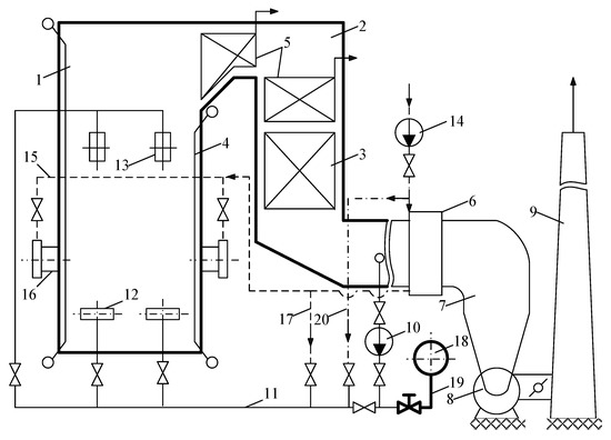 Scheme of an industrial gas-and-oil boiler with recirculating devices and added intake of complete burning products: 1—furnace; 2—flue with convective heating surfaces; 3—economizer; 4—screen pipes; 5—superheaters; 6—external air heaters; 7—connecting flues of the boiler; 8—smoke exhausters; 9—chimney; 10—boiler flue gas recirculation fans; 11—boiler flue gas recirculation flue; 12—lower flue gas nozzles for regulating the temperature of superheated steam behind superheaters 5; 13—upper flue gas nozzles to reduce temperature unevenness in combustion products leaving furnace 1 in front of superheaters 5; 14—boiler blast fans; 15—boiler air ducts; 16—gas–oil burners; 17—hot air additive air duct; 18—gas outlet for the discharge of complete combustion products from the gas-turbine generator; 19—gas outlet for the additive of complete combustion products combustion from a gas-turbine electric generator; 20—cold air additive duct.