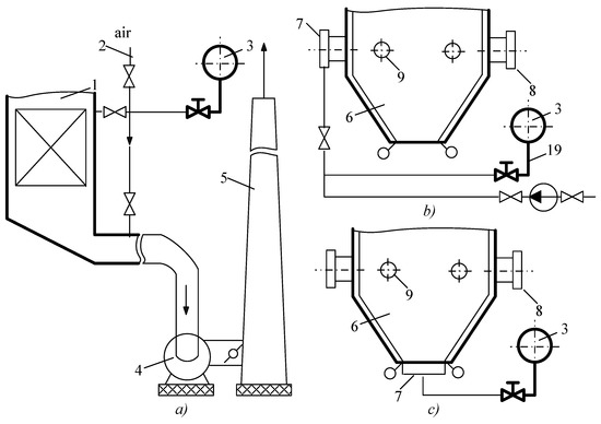 Schemes for the use of combustion products in the technologies of existing boilers: (a) replacement of hot air with full combustion products to eliminate low-temperature corrosion; (b) replacement of blast furnace gas with incomplete combustion products; (c) dispersal of reagent input with the supply of incomplete combustion products through hearth burners and air and natural gas flows through nozzles on the walls of the furnace; 1—flue gas boiler; 2—hot air pipeline; 3—flue discharge of combustion products from the gas-power sector; 4—flue pumps; 5—chimney; 6—furnace; 7—burners with nozzle input of low-reaction fuel-containing gases sealed with inert products; 8, 9—nozzles for air and natural gas input.