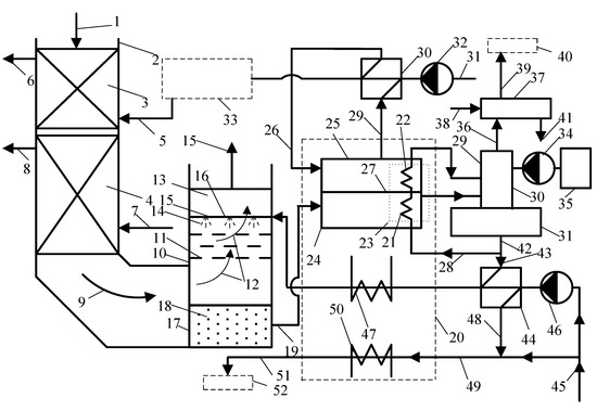 The outgoing flue gases 1 after the superheater of the power boiler unit with natural circulation of the steam-water medium enter the downpipe 2 with convective heating surfaces 3 and 4. In the economizer 3, feed water 5 is heated, which enters the boiler unit after the thermal preparation system. The heated feed water 6 enters the boiler drum. Atmospheric air 7 is pumped into the air heater 4 by a blow fan. The heated air 8 is sent to the fuel supply system, the burner device or directly to the furnace, depending on the type of fuel being burned and the fuel preparation system. In convective surfaces 3 and 4, flue gases are cooled to a temperature of 110–140 °C. The gases 9 cooled to this temperature are sent to a convective heat exchanger 10 with a passive nozzle 11. In the heat exchanger 10, flue gases 12 pass through a passive nozzle 12, into which cooled water 14 is sprayed from the upper part 13 of the heat exchanger from nozzles 15 connected to the pipeline system 16. The water sprayed by the nozzles 15 and 14 reacts with the flue gas components 13. Part of the triatomic gases, primarily CO2, as well as NOx and SOx, are adsorbed by water 14 and flow into the lower part 17 of the heat exchanger 11. The water saturated with gases 18 is sent through the pipeline system 19 to the advanced absorption Li-Br refrigerating machine (absorption refrigerator) 20.