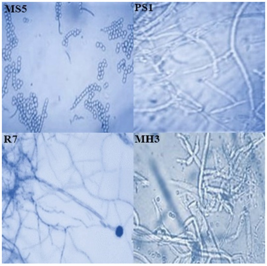 Microscopic photographs of MS5 (Penicillium oxalicum), PS1 (Fusarium solani), R7 (Aspergillus niger) and MH3 (Trichoderma harzianum) at 40× magnification.