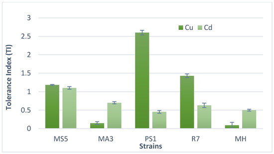 Different fungi exhibited variable MICs and MS5 showed the most resilience against both metals (Table 6). Tolerance index revealed the best tolerance of Cd by MS5 while PS1 exhibited the highest tolerance against copper (Figure 4).