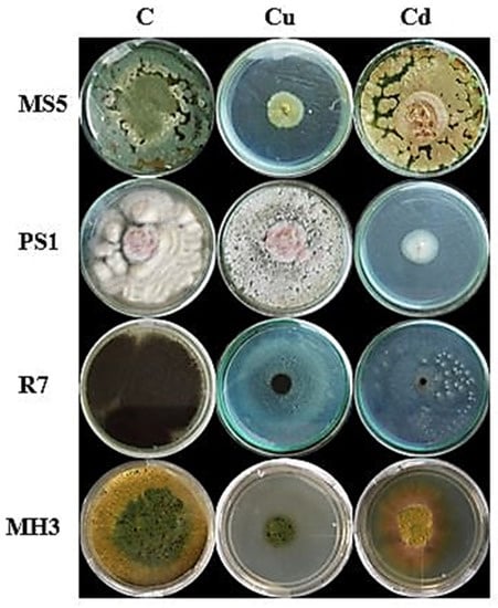 Metal exposure resulted in changing the morphology of fungal colonies and these changes were more prominent at higher metal concentrations (Figure 5). Under Cu stress, colonies of MS5 strain appeared dirty green and under Cd stress, these colonies were yellowish green in color. Strain PS1 showed small and separated colonies on Cu amended media, while these colonies were creamy in Cd amended media. In the presence Cu, strain R7 formed a black colony in the center with whitish mycelia from the edges. In Cd-amended media, R7 colonies were whitish in color and were distributed in the plate. Under the exposure of Cu, the color of MH3 did not change much but suffered a strong growth inhibition. This growth inhibition could also be observed under Cd stress.