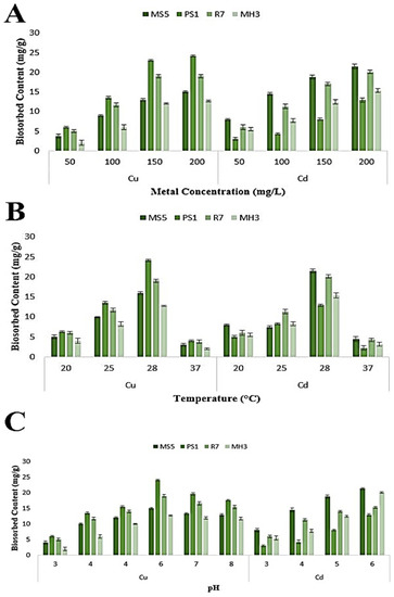 Biosorption of metal ions by various fungal isolates was affected by metal concentrations (A), temperature (B) and pH (C). In this analysis for fungal strains viz. MS5 (P. oxalicum), PS1 (F. solani), R7 (A. niger) and MH3 (T. harzianum) were used. Bars indicate standard errors of mean.
