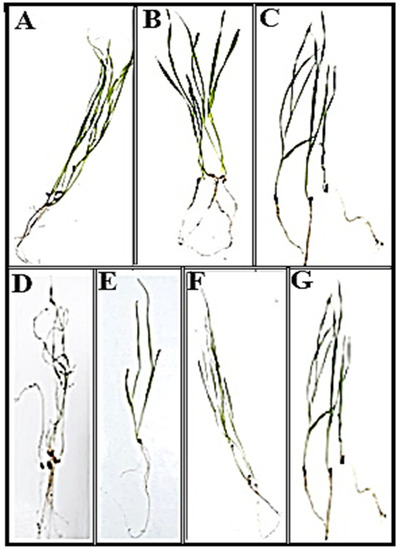 Effect of different treatments on wheat seedlings. (A) Uninoculated seedlings without stress, (B) Seedlings under the influence of PS1 (F. solani), (C) Seedlings under the influence of MS5 (P. oxalicum), (D) Seedlings under 0.5 mM Cu, (E) Seedlings under 0.5 mM Cd, (F) Seedling under the influence of PS1 (F. solani) and 0.5 mM Cu, (G) Seedling under the influence of MS5 (P. oxalicum) and 0.5 mM Cd.