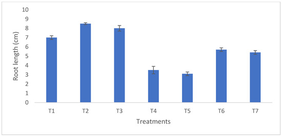 Influence of various treatments on root length. (T1) Uninoculated seedlings without stress, (T2) Seedlings under the influence of PS1 (F. solani), (T3) Seedlings under the influence of MS5 (P. oxalicum), (T4) Seedlings under 0.5 mM Cu, (T5) Seedlings under 0.5 mM Cd, (T6) Seedling under the influence of PS1 (F. solani) and 0.5 mM Cu, (T7) Seedling under the influence of MS5 (P. oxalicum) and 0.5 mM Cd.