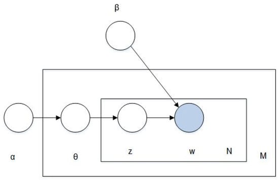 25]. The core idea of the LDA model is to regard topics as the probability distribution of text words and different topics corresponding to other text word distributions. In the field of image annotation, we need to extract the low-level features of the image and perform clustering. Then, we use the clustering algorithm to vectorize the low-level features of the image into visual words. Finally, we use the BOW model to convert the image into a set of visual words. The LDA probability graph model is shown in