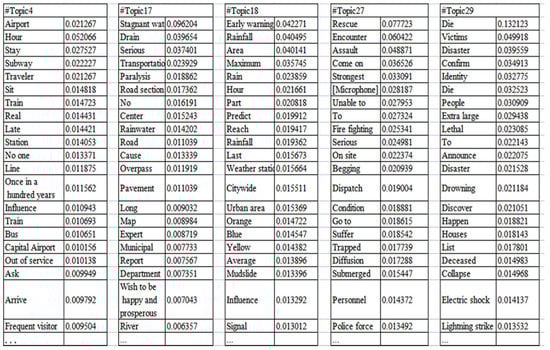 Table 4 deduplication, Chinese word segmentation, stop word removal, and emoji preprocessing were performed on the 25,880 Weibo datasets obtained from Weibo. The vocabulary expression of each Weibo dataset was obtained, and the data were manually labeled to obtain the corresponding Weibo vocabulary collection and emergency themes. To verify the accuracy of the model classification, 20% of the samples were randomly selected as the test set and the remaining 80% were used as the training set. Using the LDA model as the topic classification model, the topic distribution of the sample documents and the respective feature vocabulary distributions of all the topics were obtained. Some of these themes are shown in