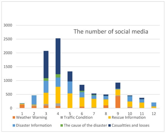 Figure 9, little attention has been paid to weather warnings during heavy rains, though it began on 19 July. Henan experienced a heavy storm; people started to release weather warning information via Weibo, so the number of Weibo posts with a weather warning on 19 July was significantly more than that of other subjects, and on 27 July the typhoon “fireworks” affected Henan, so the number of microblogs regarding weather warning increased on 27 July. With the development of catastrophes, the number of microblogs regarding disaster information rapidly increased on 19 July. On 24 July, as rainfall declined, people’s concerns about disaster information gradually decreased. Heavy rain caused huge damage to Henan; therefore, it can be seen in