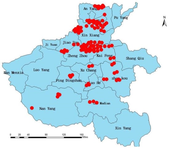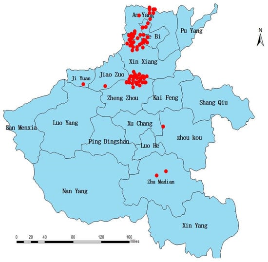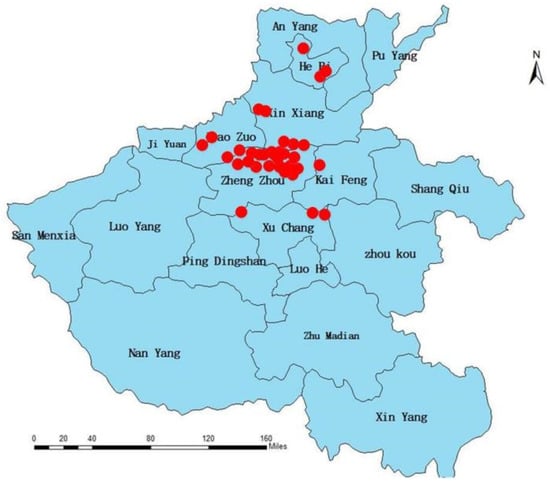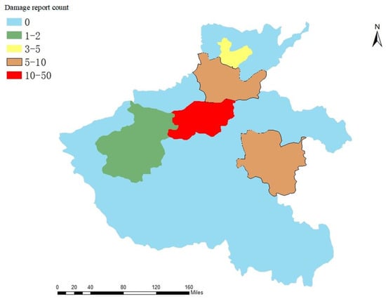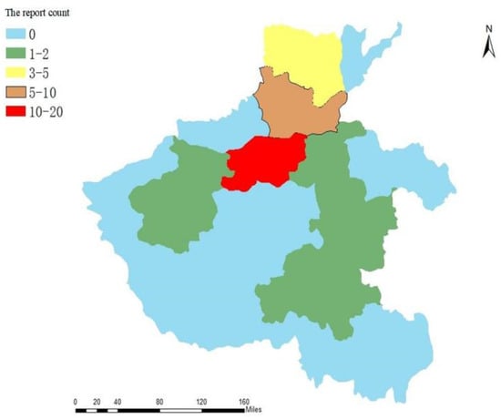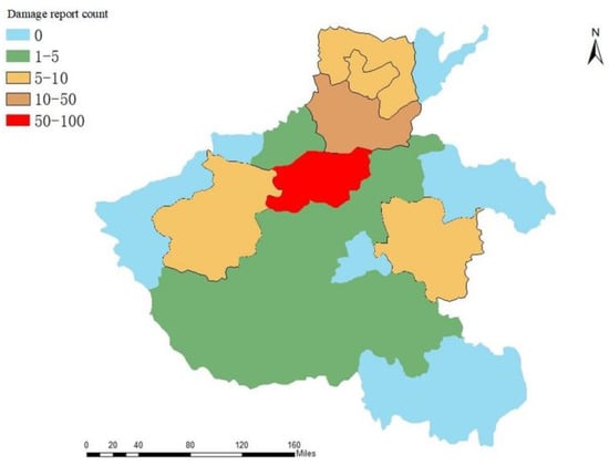 Figure 18, we can infer that the Weibo posts of casualties and losses are mainly concentrated in Zhengzhou City because Zhengzhou City experienced a greater impact from heavy rains, and Zhengzhou has a large population. At the same time, Hebi and Anyang had a small number of casualties, and loss microblogs were posted in Zhumadian and Luoyang. It can be seen that the number of casualties and loss microblogs is related to the severity of the heavy rains in each city and the population density. At the same time, compared with the number of rescue information microblogs, the distribution of casualties and losses was more concentrated in Zhengzhou. This is because during heavy rains, people use microblogs to seek help and find missing persons, and such microblogs attract more public attention. A large number of reposts were generated. Therefore, the Weibo location information of casualties and losses is more accurate and concentrated.