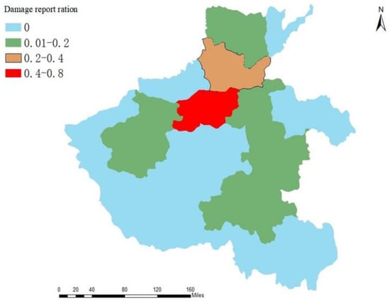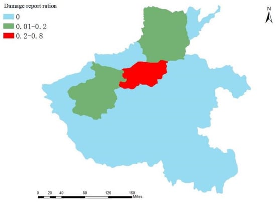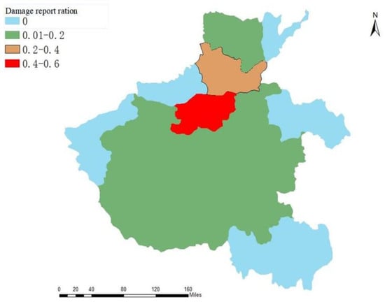 Figure 12 calculates the damage reporting ratio for all tweets in each city. In the work of Zou et al., the damage reporting ratio is considered as the ratio of disaster-related tweets to the total number of tweets, which is the damage severity metric: its value range is 0–1. Based on the data contrasted in