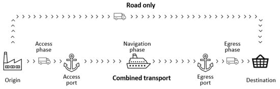 - Access phase: The phase starts from the origin of the goods’ journey to the departure of the Ro/Ro-Pax service. This phase is characterised by a journey on the road, whereby the full information of the trip is available, specifying the break and rest periods on the road trip or in the parking areas of the port, and the duration of the operational activities (loading/unloading operations and ticket control). Therefore, the relevant information is the origin of the voyage, the time and distance travelled by road, the rest periods, and the time spent in the port.