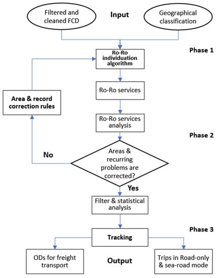 The proposed methodology (Figure 2) is made up of three phases using the information from the previous analyses to refine the subsequent ones. The first phase allows for the identification of the users of Ro-Ro/Ro-Pax services as all those vehicles produce records in one port area and then consecutively in another by sea. The second phase consists of the analysis of vehicles using Ro-Ro/Ro-Pax services, which is necessary to correct the port geometries and to identify recurring problems of the data in the case of a loss of signal. In the third phase, the vehicles are tracked to define the origin and destination of the trip from the point of view of the goods in the combined transport mode. The variables contributing to the modal choice were investigated through a comparison of the trips with the same origin and destination, but which used different transport modes.