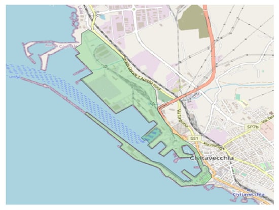 - The classification of the territories by geometries in which the study area is determined; the relevant ports and a coastal area cordon are defined, for which the services used should not be considered. Subsequently, the definition of the maritime and port geometries occurs (Figure 3), which is of fundamental importance due to the different behaviours and degrees of accuracy of the OBUs of the vehicles. The land-side port geometry follows the port boundaries, while the sea-side geometry has to consider the size of the ferries.