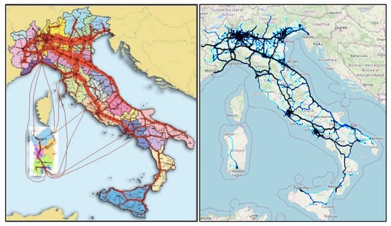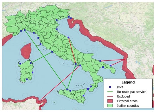 Due to the heterogeneity of the record production methods, a subset of vehicles with homogeneous sampling was considered. The sample was identified on the basis of an analysis of the average sampling times varying between 2 s and 818 s and the standard deviation between 0.5 s and 671 s, considering the total number of records produced. The filter reduces the sample to 7529 vehicles, meeting the constraint of having generated at least 4000 signals in a month with average sampling times between 30 s and 180 s. The application was carried out on a sub-sample of Italian ports, considered also in the maritime network of the simulation model, formed by the 26 ports where Ro-Ro traffic is expected: Ancona, Arbatax, Bari, Brindisi, Cagliari, Catania, Civitavecchia, Genoa, Gioia Tauro, La Spezia, Livorno, Messina, Monfalcone, Naples, Olbia, Palermo, Piombino, Porto Torres, Ravenna, Salerno, Savona, Taranto, Termini Imerese, Trieste, Venice, and Villa San Giovanni. Moreover, the following elements were defined (Figure 4): the port geometries of the berths, considering the maximum size of the ferries circulating in Italy; the geometries relating to the Italian counties; and the cordon geometry (which replaces the land-side geometry outside the Italian state) corresponding to a coastal strip covering the entire Mediterranean Sea.
