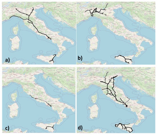 Path choice of FCD trips for each service: (a) Salerno–Messina; (b) Palermo–Genoa; (c) Catania–Salerno; and (d) Palermo–Naples.