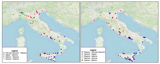 Specifically, for October 2019, the execution of the algorithm identified that the Ro-Ro/Ro-Pax services were used 1201 times. The Villa San Giovanni—Messina connection was the most used, with a total of 944 trips, highlighting the propensity of Italian freight transport to use the road-only mode. The second phase represents an iterative phase of the correction of geometries, areas, and signals identified in the first phase. It consists of the analysis of records prior and subsequent to the use of maritime services, showing the following localisation problems: