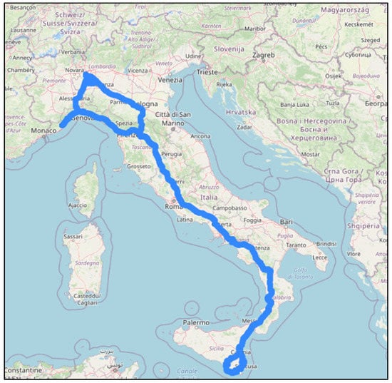 The analysis shows a recurring behaviour of trucking companies. In detail, the tracked vehicles were 64, and, during the period of analysis, 25% only used the road-only transport (about 8 times each). A total of 14% of the vehicles used both modes of transport, with an average use of Ro-Ro services of 5 times per month; 11% used different combined transport services 7 times per month; and 50% maintained the same combined transport service with an average number of monthly uses of 1.5. It follows that 75% of drivers did not change their mode of transport during the month under analysis, underlining the possibility of a propensity for a specific mode of transport. The investigation identifies the establishment of relationships between the plants and trucking companies that regularly move between the same ODs (two or more). For these vehicles, there is a strong sense of habit in the mode, route, destinations, and travel times. As an example, Figure 8 shows the route taken by a driver in the month of analysis, which illustrates the factors above.