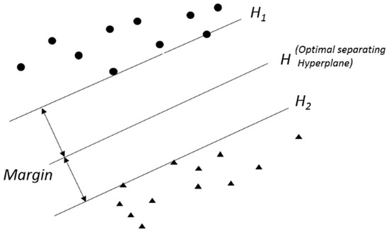 In Figure 1, while there are no datapoints between the H1 and H2 decision boundaries, the points that are located on H1 and H2 are the support vectors determining the optimal hyperplane, while other points on the training dataset do not contribute towards defining the hyperplane [86,88].