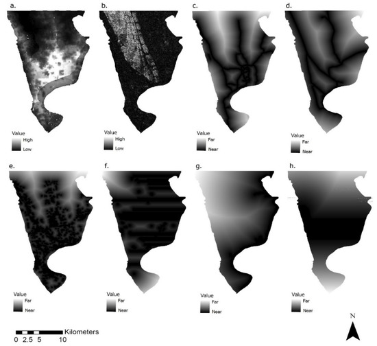 (a) Population density, (b) slope, (c) distance to roads, (d) distance to rail, (e) distance to commercial areas, (f) distance to ponds, (g) distance to rivers, (h) distance to forest and parks.