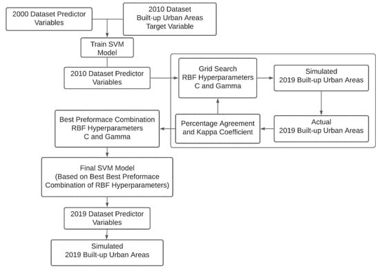 For this study, the SVM model was first trained using predictor variables from the 2000 dataset and the built-up urban area target variable for the 2010 datasets using the RBF kernel function. Next, the trained model was applied to the 2010 predictor dataset to simulate the built-up urban area target variable for 2019. The hyperparameters for the RBF kernel function used in the SVM model were tuned through a grid search process for each pair of C ∈ {0.1, 1, 5, 10, 50, 100} and ∈ {0.1, 1, 5, 10, 50, 100} to determine the best performance combination of these hyperparameters for the model. Lastly, the best performance combination of the hyperparameters obtained from the grid search was used to create the final SVM model, which was applied to the 2019 predictor data to simulate the growth of built-up urban areas for 2040. A detailed representation of the model is shown in Figure 4.