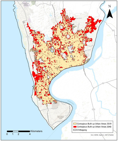 With Chattogram experiencing increasing population growth and rapidly and uncontrollably expanding urban build up areas, adoption of UGBs for the city could provide the robust forward-looking policy/regulatory framework necessary to curtail this haphazard growth by restricting and directing the expansion of built-up urban areas while emphasizing sustainable urban growth. The areas highlighted in red in Figure 5, the contiguous built-up urban areas, provide a strong foundation and an excellent starting point for city planners and decision-makers to examine an establishment of a potential UGB for Chattogram for the next 20-year time period. This simulation of future contiguous urban growth for year 2040 was specifically created based on the business-as-usual assumption, without accounting for any unforeseen future influences from unprecedented changes in population, economy, environment, policies, or politics [55]. Additionally, the urban growth simulation was performed using only land cover data, topographic features, and population density information due to limited availability of free datasets.