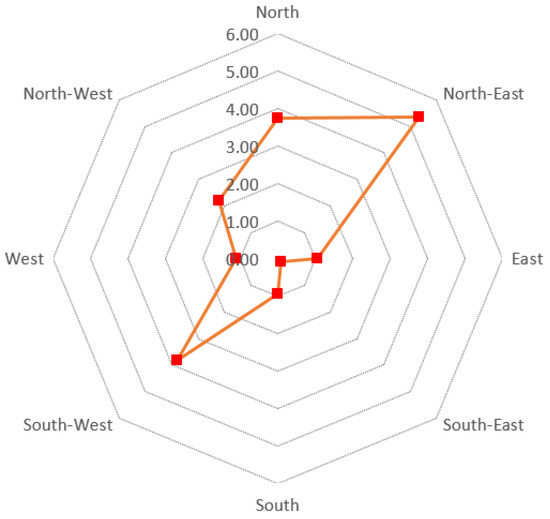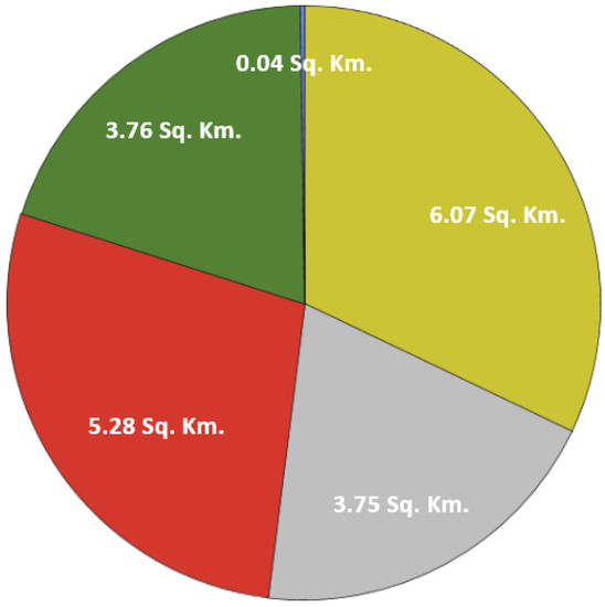 The SVM model based on the best performance combination of the hyperparameters was applied to the 2019 dataset, using it as the predictor variable to simulate the future built-up urban areas for 2040 in Chattogram. Keeping in mind the overall goal of the UGB to promote contiguous urban growth, isolated patches of built-up urban areas simulated by the model that appeared outside of the largest contiguous built-up urban area were excluded from the analysis. The results from the SVM model-based simulation for 2040 (Figure 5) predicted an increase of 18.27 km2 of contiguous built-up urban areas from base 2019 levels over the next twenty-year time period for the city of Chattogram. A majority of growth in the built-up urban areas is expected to occur in the north-eastern region (5.33 km2) and along the south-western region (3.81 km2) of Chattogram (Figure 6). Alarmingly, a large portion of this expansion in the south-western corner of Chattogram is expected to occur in areas with a high risk of flooding due to its proximity to the bay. The other regions of the city showed limited expansion of built-up urban areas. When examining the land cover change (Figure 7), current agricultural land cover, with 6.07 km2, is predicted to be the biggest land cover type to be converted into the contiguous built-up urban land cover. This is followed by the inclusion of 5.28 km2 of built-up urban land cover, that were previously scattered outside of the contiguous area and are now included as a part of the contiguous region for 2040, and nearly equal amounts of vegetated (3.76 km2) and barren (3.75 km2) land cover being converted as a part of the contiguous built-up urban region.