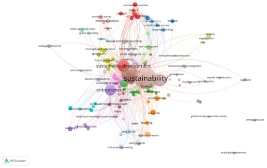 The research was based on the articles analyzed on sustainability and digital transition. The associated keywords can be examined in Figure 6, making clear the network of keywords that appear together/linked in each scientific article, thus allowing to know the topics studied by the researchers and identify future research trends. In Figure 7, a profusion of bibliographic couplings with a unit of analysis of cited references is presented.