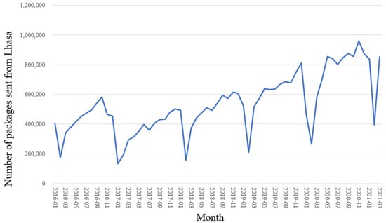The monthly number of packages sent out from Lhasa, including both urban and rural areas, was queried from the Lasa Municipal Postal Administration [] since January 2016, as shown in Figure 1. During the 63 months, the minimum value was 132,900 packages in February 2016, and the maximum value was 959,800 packages in November 2020. Additionally, the average value was 534,500 packages. It can be seen that the number of sent packages has an obvious seasonal variation pattern, with a trough around February and a peak around November. Overall, the number of packages sent out from Lhasa is growing year by year. In 2020, the number was over 8 million packages.