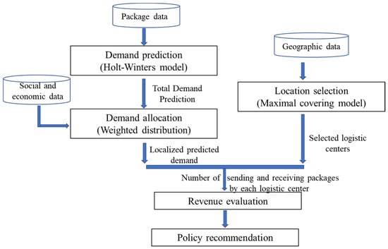 In this section, a procedure is introduced for locating logistics centers in rural areas in Lhasa. Figure 2 shows the major stages. We first predict logistic demand for Lhasa based on the Holt–Winters model. The predicted demand is then assigned to each town in Lhasa based on several factors including population, number of industrial enterprises, etc. Meanwhile, we apply the maximal covering model to locate logistic centers in rural areas in Lhasa and conduct sensitivity analysis under different service radius and number of logistic centers. Finally, with the predicted demand and selected logistic centers, revenue evaluation is conducted to check if the selected centers can balance their future incomes and expenses. The procedure takes into consideration both demand coverage rate and logistic centers’ potential profitability.
