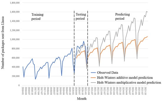 Forecasting logistic demand with the Holt–Winters method. (The Holt–Winters multiplicative model fits real data well in the testing period and provides a relatively high prediction in the future).