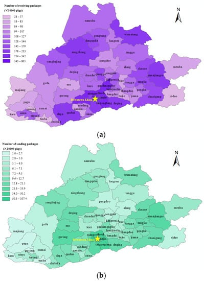 Figure 4. (a). Allocated number of receiving packages in each town. (b). Allocated number of sending packages in each town. (As shown in the figure, towns around downtown Lhasa are predicted to have relatively high demand for sending and receiving express packages in 2025. The demand varies greatly between different towns).