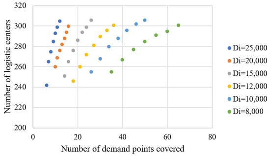 Table 5 shows how the marginal efficiency changes under different service radius and number of logistic centers. For the service radius of 25,000 m and 20,000 m, when the coverage rate reaches 90% (over 298 villages), the marginal efficiency is greater than 6, which is theoretically a highly efficient option. However, it leads to long distribution distances, poor timeliness, low service level, and complex distribution route organization, if there are too few logistic centers. For the service radius of 8000 m, the marginal efficiency is less than 3 when the coverage rate is lower than 80%, which is too low to be selected in this study. For the service radius of 15,000 m, 12,000 m, and 10,000 m, the fewest logistic centers are needed with a service radius of 15,000 m when marginal efficiency is 3. Therefore, we choose 15,000 m as the service radius. Accordingly, the number of located logistic centers is 22, covering 294 villages, i.e., 88.8% among demand points.