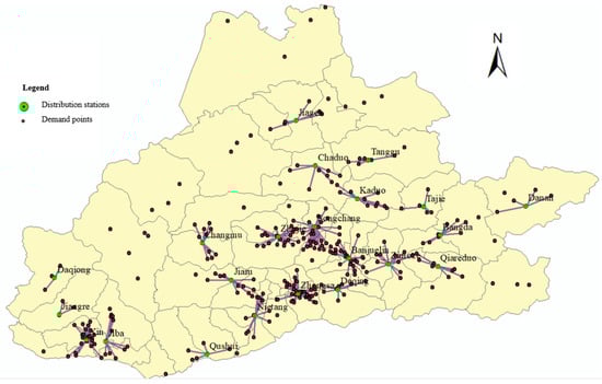 Spatial distribution of the selected logistic centers and covered demand points. (This figure shows how the 22 logistic centers cover 294 villages in Lhasa).
