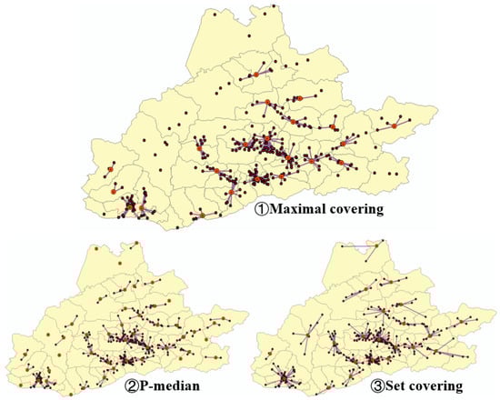 The proposed MCM is further compared with two other models, i.e., p-median model and set covering model, as shown in Table 9 and Figure 7.