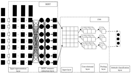 As shown in Figure 1: The work used the deep bidirectional transformers (BERT) developed by the Google AI team with strong semantic comprehension. It has been testified to be effective for understanding unlabeled text by jointly conditioning on both left and right context in all layers [50]. The BERT was trained to deal with various natural languages so that it could accurately understand the contextual word meaning of a tweet and becomes a better tweet encoder. Convolutional Neural Networks (CNNs) were used for text classifications. As a popular deep learning model, the CNN has achieved great success in processing computer vision images and speech recognition, highlighting text classification tasks [51,52,53]. Features were extracted on the tweet text using parameters publicly available by Google to pre-train BERT. Afterward, context words output by the transformer were input to the CNN model for parameter learning, with the model parameters of the CNN updated.