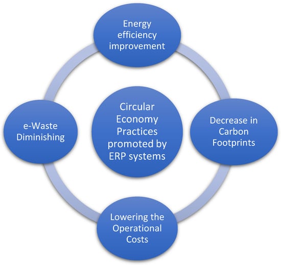 Another direction of promoting CE practices through cloud ERP is represented by decreases in carbon footprints [,,]. There is a significant body of literature which addresses the issue of CO2 emissions as a proxy for measuring cloud computing contribution to sustainability. Frequently, the carbon footprint issue is approached form the point of view of its direct or indirect relationship with the optimization of energy consumption. The advantages brought about through cloud computing employment by enterprises from the SME sector, with respect to energy efficiency and decreasing carbon emissions, were also put forward by Williams et al. []. The authors established a mathematical model in order to assess the impact of the wide-range adoption of cloud computing solutions in 11 countries across the globe, with the highest degree of cloud penetration (over 80%). It turned out that approximately 4.5 million tons of CO2 emissions could be mitigated in the analyzed countries through a massive adoption of cloud computing solutions. Moreover, 60% of the total savings could be attributed to small businesses’ influence. In addition to the significant macro-level impact, the move towards green computing yields, in the long run and at the micro level, various indirect benefits, such as: augmented levels of operational efficiency, workforce reductions, accurate customized services, appropriate brand development, high purchase conversion rates, etc., which can give rise to significant improvements in performance indicators [].