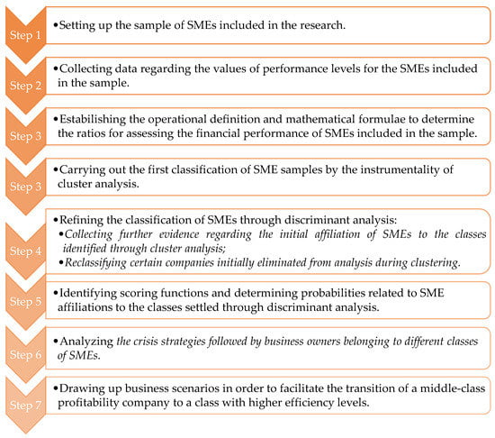 Considering the slow digitalization growth rates of SMEs in the county of Hunedoara, identified by statistical data and trends detailed in the previous paragraph, we focused our attention on those companies whose object of activity was wholesale trade of timber, building supplies and medical equipment. Through analyses of financial performance disclosed by the SMEs in this field, we aimed to conceive scenarios that might facilitate the transition of certain companies from a low efficiency class to another class, exhibiting higher values of performance indicators. The main stages of the methodology we conceived with a view of attaining the study objectives are systematized in Figure 3.