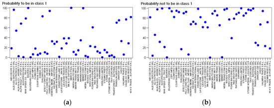 Affiliation chart for the first class of companies from the analyzed sample. (a) The probability associated to a company to be integrated in class 1; (b) The probability associated to a company not to be integrated in class 1.